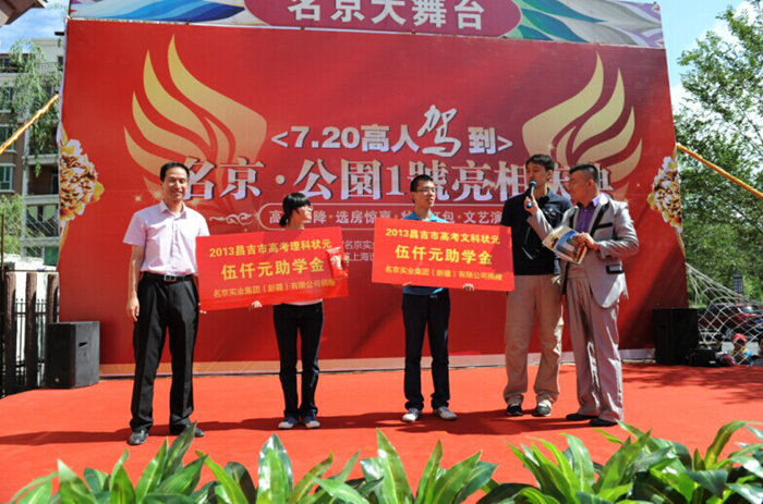 在欣赏高人表演的过程中,名京·公园1号认购第二季的抽奖活动也在昌吉市公证处的现场监督下如期举行。本次活动共抽出了一至三等奖最高1万抵4万共45位幸运客户,中奖客户欢呼雀跃,现场喜气洋洋。“名京高人”徐国翀与名京实业集团(新疆)有限公司常务副总刘新刚共同为2013年度昌吉市文理科状元送上了名京状元红包,勉励他们努力学习、报效祖国。温情的话语合着现场观众送上的阵阵热情掌声,此时的名京·公园1号开盘盛典俨然是一片温情欢乐的海洋……
