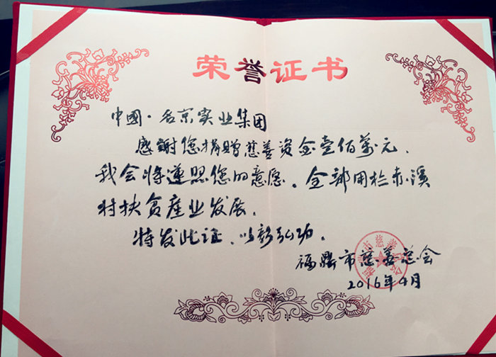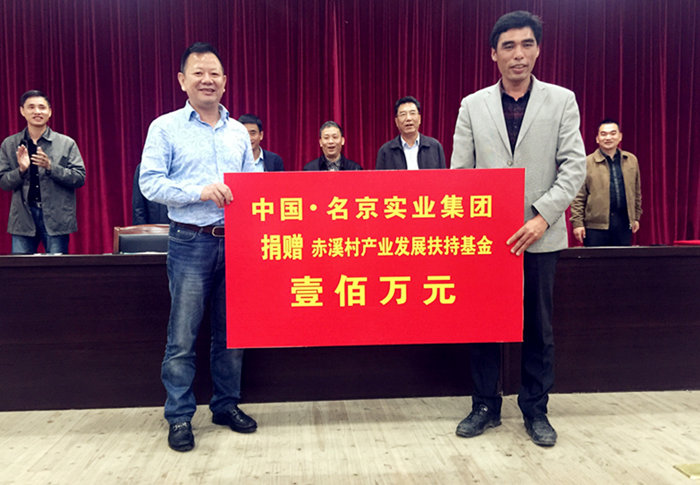 4月22日,中国名京实业集团向“中国扶贫第一村”赤溪村捐赠产业发展基金100万元,以支持赤溪村产业扶贫,帮助村民创业。福建省福鼎市市委书记刘振辉、福鼎市市委副书记连建群、福鼎市市人大常委会副主任蓝东风出席捐赠仪式,名京实业集团王念评董事长与福鼎市潘溪镇政府和赤溪村签署了捐赠书,福鼎市慈善总会为名京实业集团颁发捐赠赠书。